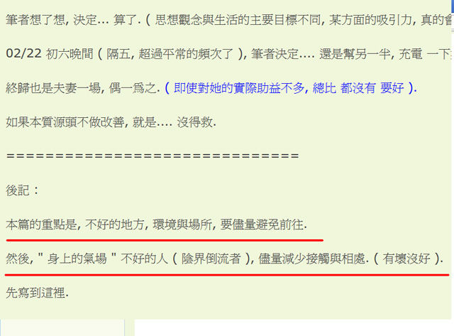 可以讓一些 " 看懂, 又願意覺悟與修正 " 的網友, 當一個參考. ( 別搞 陰界倒流 --- 不要去不好的區域與場所, 儘可能不跟 與陰界倒流 的人, 有所密切接觸 ... 所謂的密切, 不是光指夫妻關係那種啦, 而是共遊或聚會的 同伴, 或是 同住一室 ).