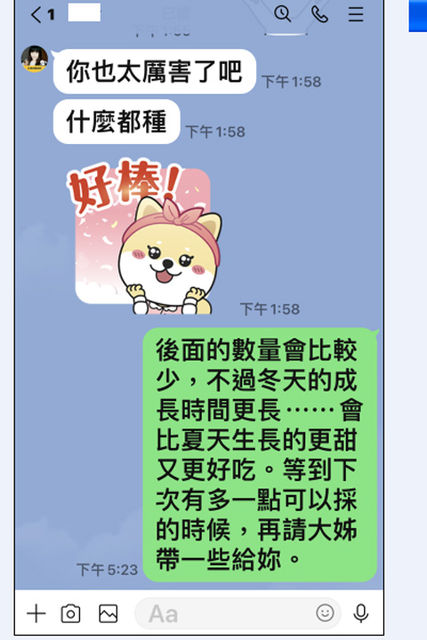對方 : 我的 ( 指 他的 ) 先前那一波, 已經都早就採光光了, 你還有, 可能是日頭沒那麼長 ( 日照時間短 ), 所以比他的採收時間, 撐得更久. ( 應該也是筆者 比較晚開始採 吧 ).