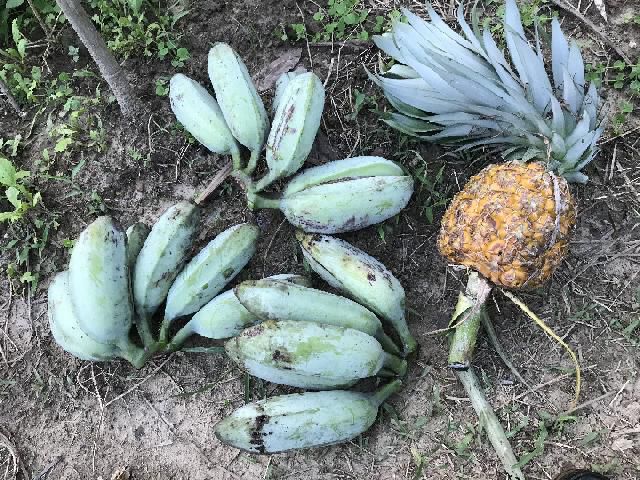 採了一顆鳳梨之後, 又看到一棵芭蕉, 已經被鼠輩給 開啃 了.